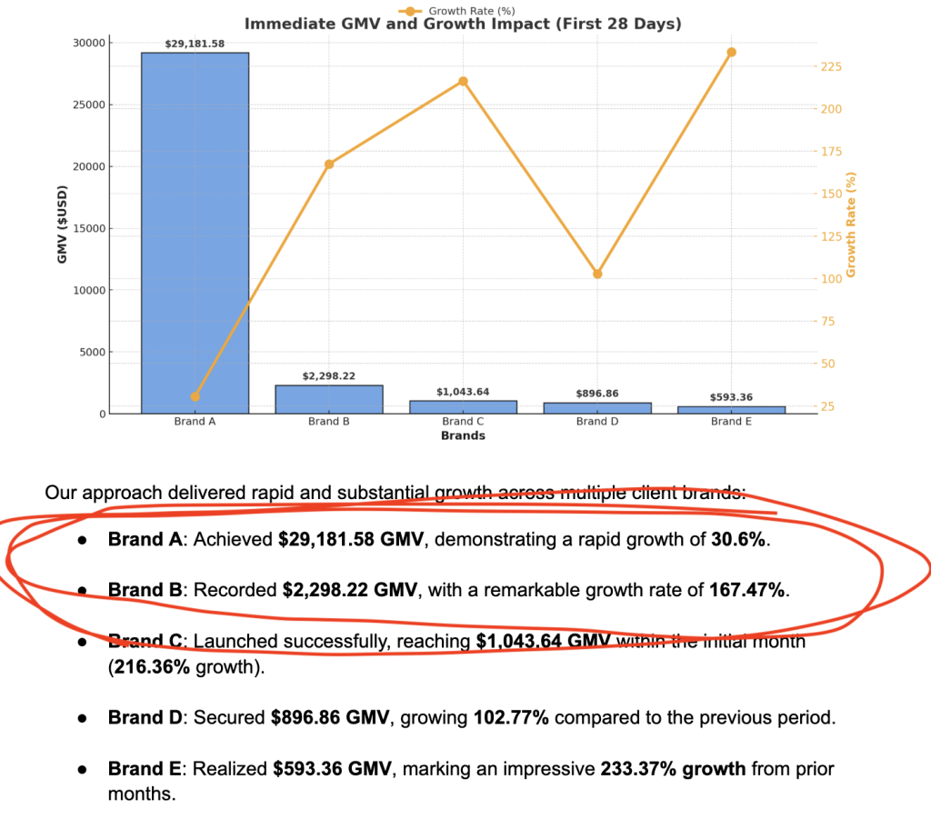 Brand A, a lifestyle accessories company, achieved an impressive $29,181.58 GMV within just 28 daysโa robust 30.6% growth rateโsimply by strategically aligning creators with their ideal audience.